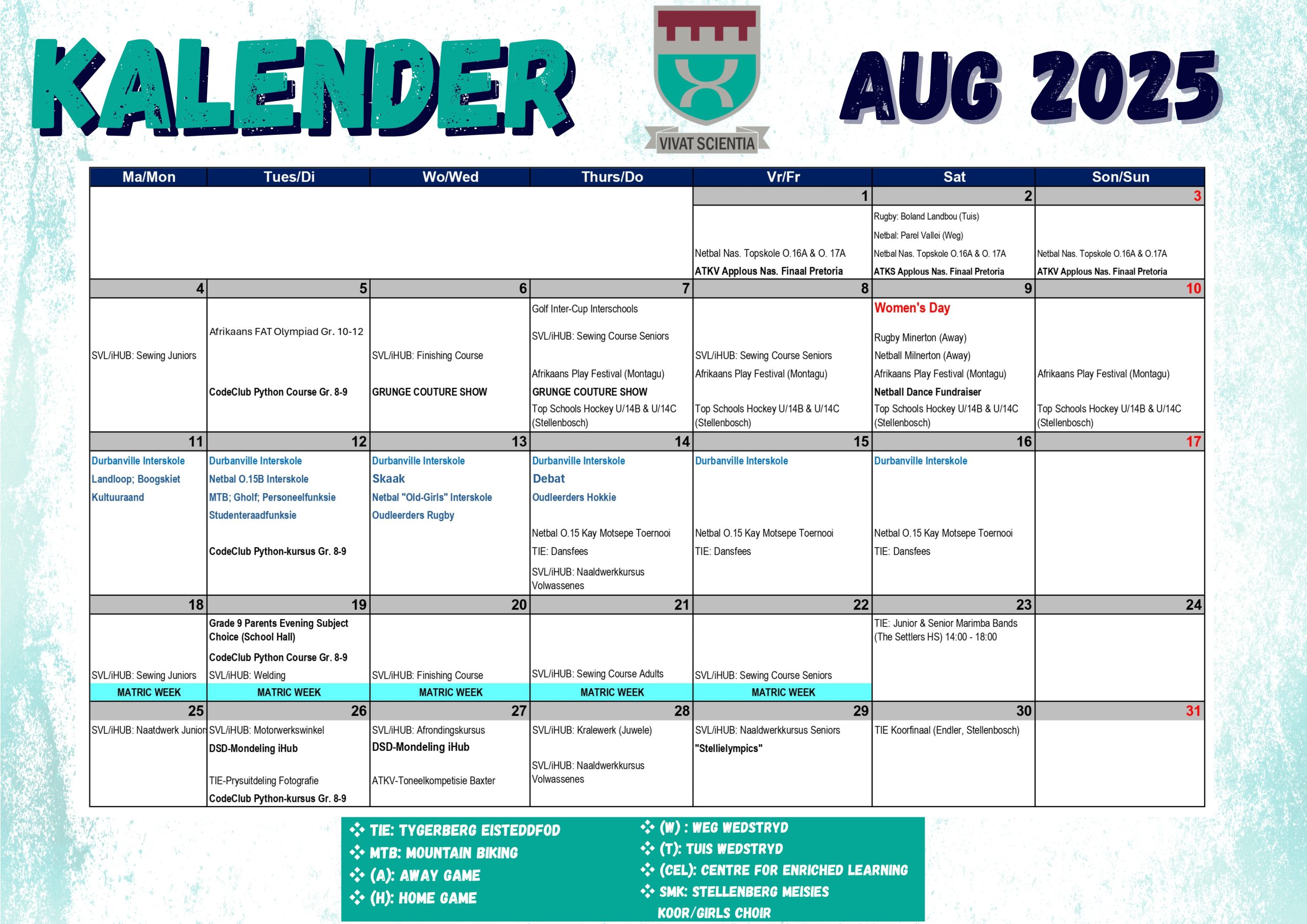 Vind hier ons belangrike datums wat jy in jou dagboek moet inskryf.